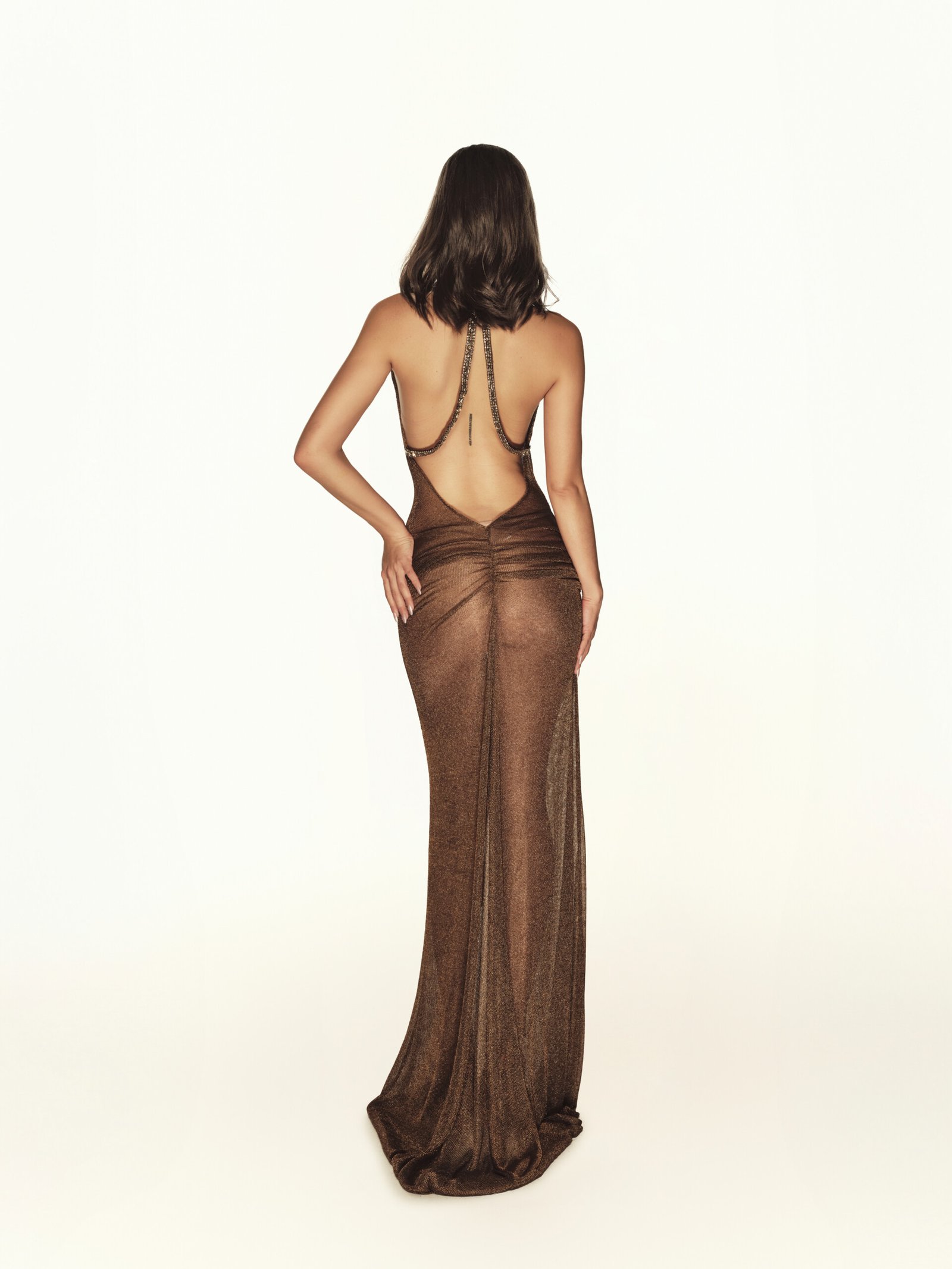Defined by fluid sensuality and a barely-there elegance, the Dakota dress makes a statement from every angle. Crafted in a shimmering sheer fabric, it skims the body with a soft drape while the open-back silhouette creates a striking, confident finish. Designed to move effortlessly, this piece blends bold allure with elevated minimalism—perfect for nights that call for drama without trying too hard.